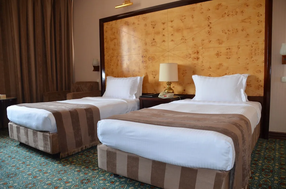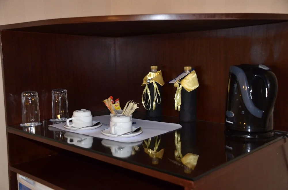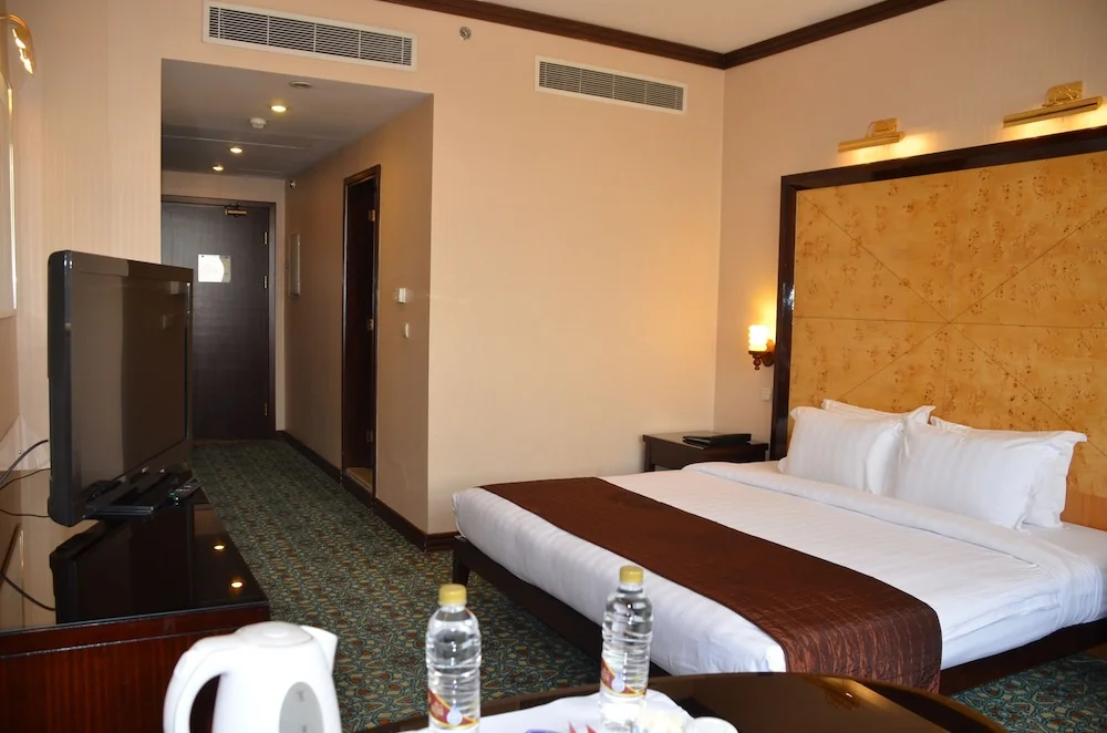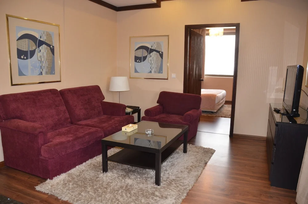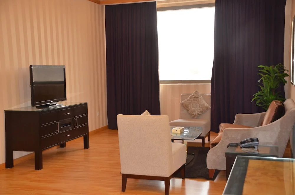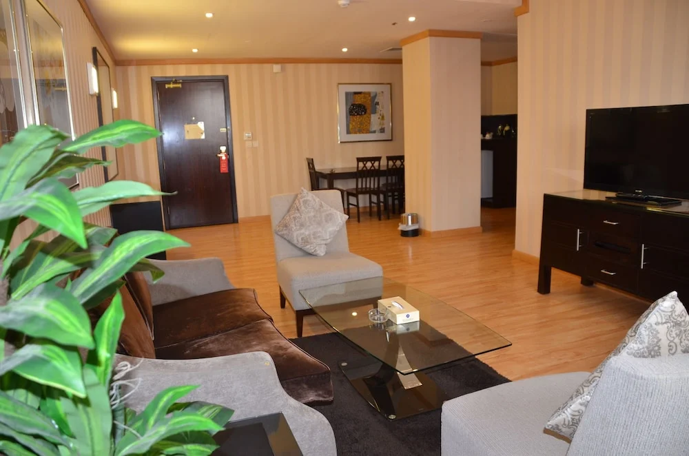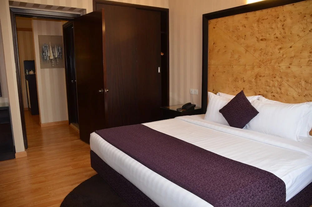 Located approximately 3 km from the city centre and 2 km from Serrafi Mega Mall, the hotel offers elegant rooms and suites with a mix of modern and classic furniture. All units feature air conditioning, a TV, and a telephone. Spacious suites also include a fully equipped kitchen with a dining area and a living room. Guests can enjoy complimentary Wi-Fi, on-site complimentary parking, and 24-hour room service. The hotel provides a modern gym, concierge service, luggage storage, safety deposit boxes, and daily housekeeping. Breakfast is available, and the hotel offers halal dining options. There is also a bar for evening entertainment. Additional amenities include airport transfer services (pre-booking required), shuttle service, dry cleaning, and laundry service. Smoking is permitted only in designated areas. Select rooms may include a refrigerator, bottled water, coffee/tea maker, mini bar, hairdryer, and toiletries.